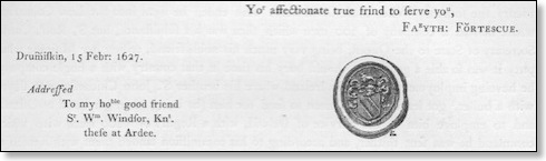 "… A rather remarkable relic of Sir Faithful's occupation of his Antrim eftate came to light fome years ago, namely, an ancient feal of arms, as shown in the annexed woodcut, with the words " S. Richart Fortefcu." It was found either upon or clofe to the former Fortefcue property. The arms are thofe of the Norman Fortefcues, viz., a bend, not engrailed, between two bendlets, quartering the arms of the Englifh Fortefcues, where the bend is engrailed. This coat implies a marriage-alliance between one of the Norman and one of the Englifh houfes. The feal has been pronounced by experts to be French of the fourteenth or fifteenth century…"