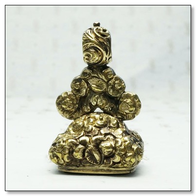 The metal of the fob is gold sheeted, a process where a thick layer of gold was laid over a base metal to create a heavily detailed yet durable design.