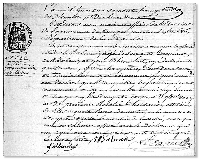Par devant nous Thomas François Quenault la Groudière, officier de l'etat civil maire de la commune du Desert, canton de Saint-jean de Daye département de la Manche, est comparu Hervé François Defortescu (HV02) cultivateur agé de quarante ans domicilié au Dézert, lequel nous a présenté un enfant du sexe masculin, né d'hier à quatre heures du matin, de lui déclarant, et de Catherine Suzanne Birée son épouze agée de trente neuf ans, auquel il a déclaré lui donné les prénoms de Théodore Aimable; La dite déclaration et présentation faite en présence de Charles Le Bas adjoint agé de cinquante un an et de Charles Aupoix agé de soixante onze ans tous les deux cultivateurs et domiciliés au Desert, et ont le déclarant et témoins signé avec nous le présent acte de naissance aprés qu'il leur en a été fait lecture.